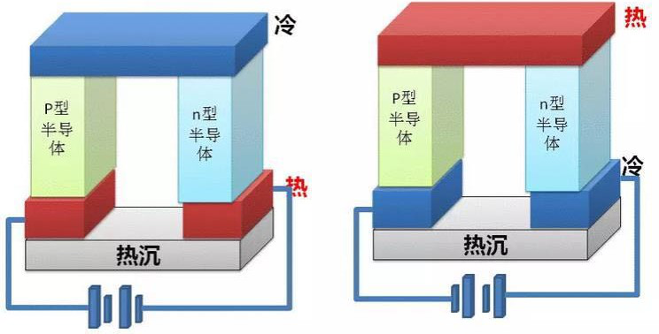 图 1. 珀尔帖效应,PN 偏节以及热流动示意图