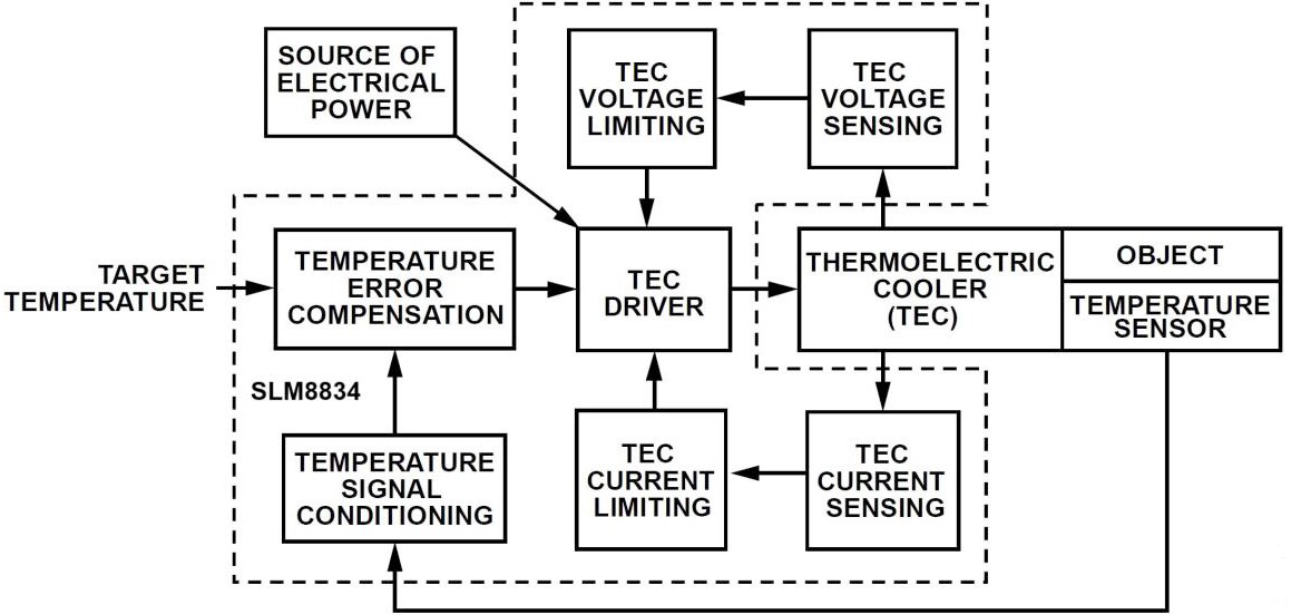 TEC 工作在致冷还是加热状态,以及致冷、加热的速率,由通过它的电流方向和大小来决定。为了达到良好的控温的精度和稳定性,就需要一个高性能的 TEC 的控制芯片,这个芯片不仅能够给TEC 提供一个可靠的、可控的高效电源,而且能够保护 TEC 材料。
